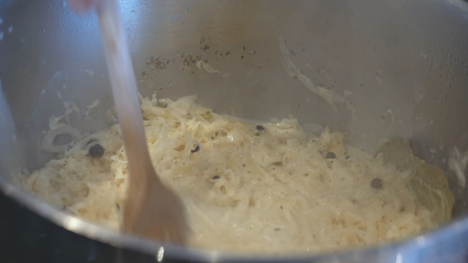 Die geschnittene Zwiebel in etwas Öl-Buttergemisch kurz dünsten und das Sauerkraut zugeben. Mit Wasser oder Rindsuppe aufgießen und weich dünsten. Das Obers, Lorbeer und Wacholderbeeren zugeben und sämig einkochen. (Eventuell mit etwas Stärkemehl binden). Die gebackenen Käseknödel darauf anrichten, mit brauner Butter und frisch geschnittenem Schnittlauch volle